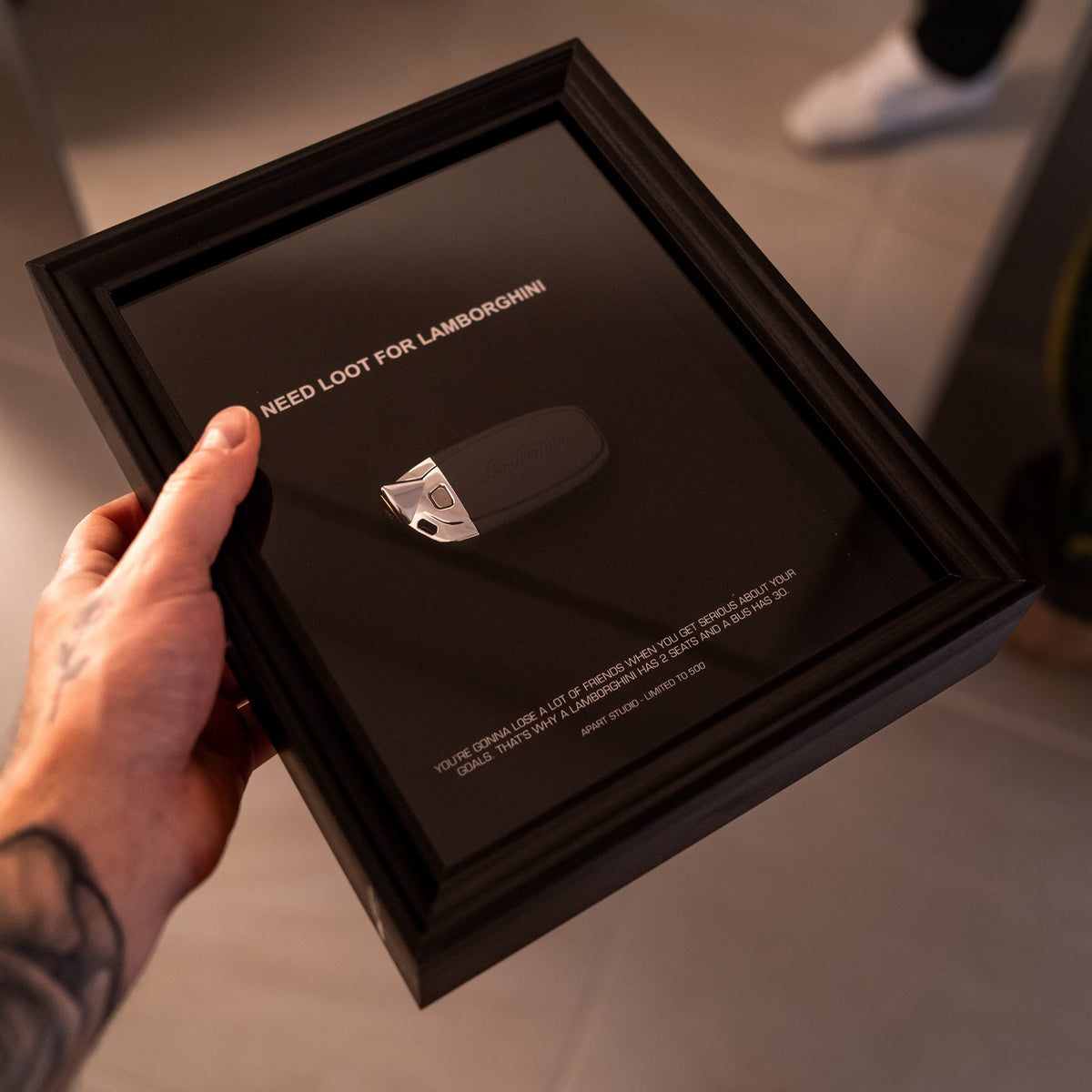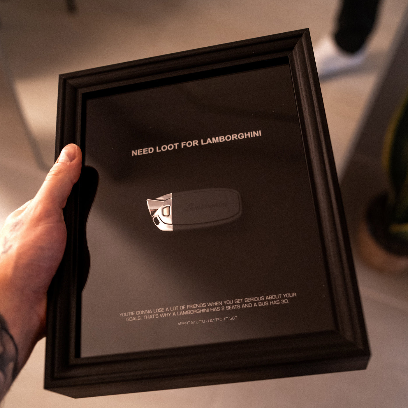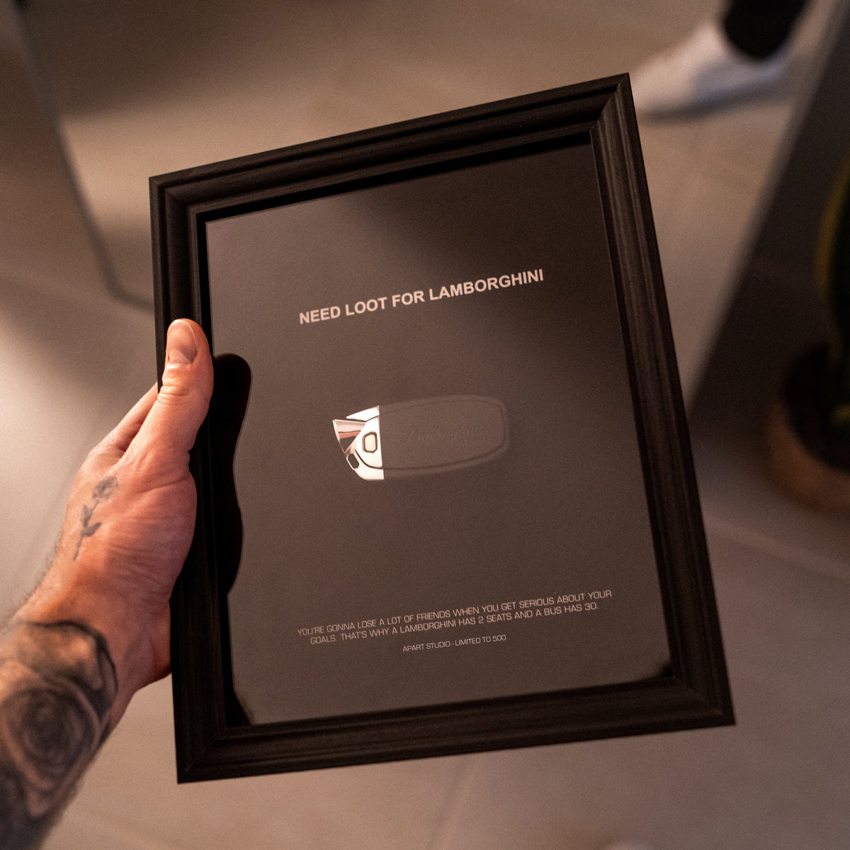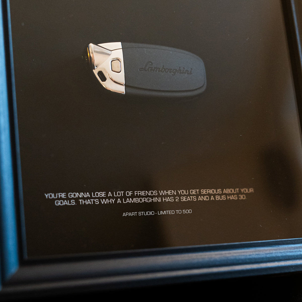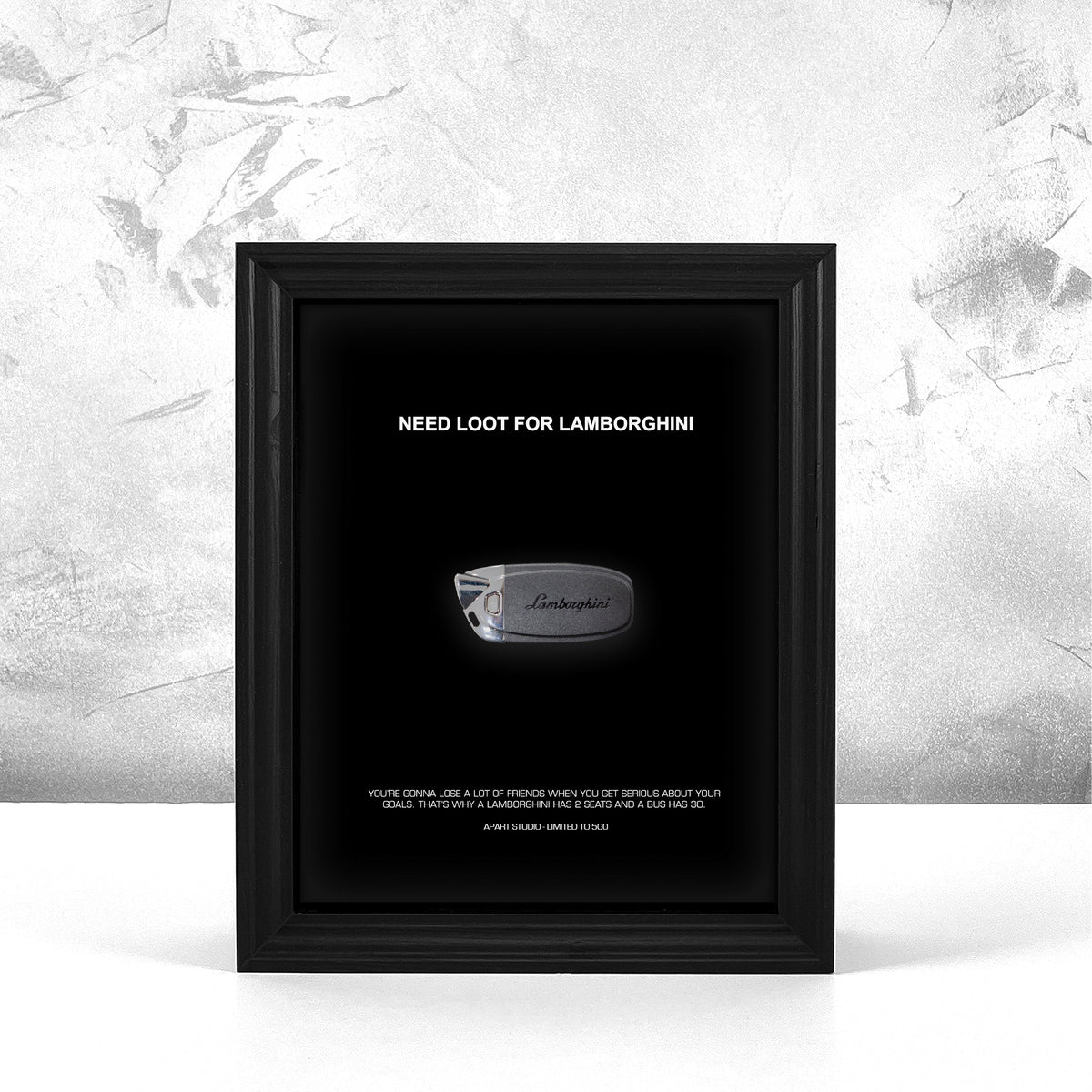 What good is money if it can't buy you some boys toys? Like a crazy Lamborghini sitting on the driveway. We're helping keeping that dream alive with this luxury minimalist frame, finished with some motivational details.